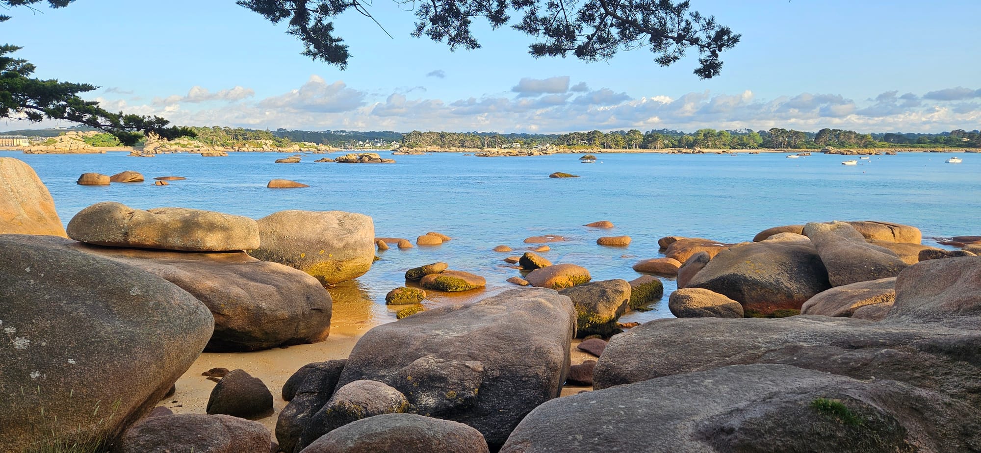 Après une nuit arrosée de temps en temps par une petite pluie, lever à 5h pour partir à 7h afin que la marée soit haute. C'est nécessaire pour éviter de porter les kayaks sur une longue distance dans les galets, et pour avoir le courant dans la bonne direction pour rejoindre Loguivy. Nous découvrons l'importance de la planification.
